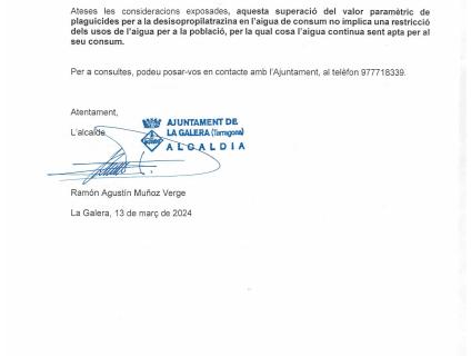 Comunicat de la qualitat de l'aigua a tot el terme municipal de la Galera