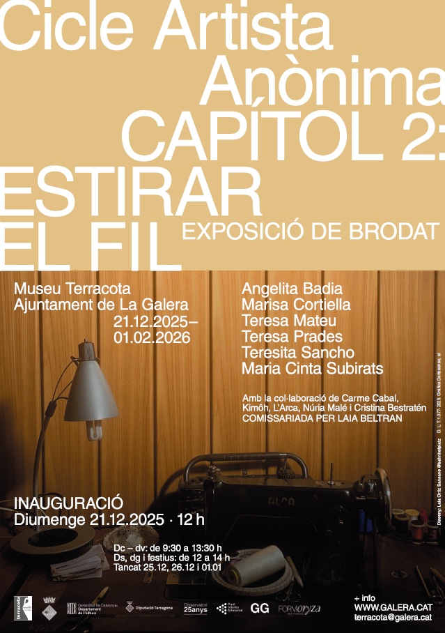 Artista Anònima és un cicle anual del Museu Terracota — Centre d’Interpretació de la Terrissa de la Galera que realça el treball artístic i artesanal de les dones grans de les zones rurals, reinterpretant-lo des d’una mirada contemporània. Es va inaugurar el desembre de 2024 amb el primer capítol, L’ALTAR FLORAL, una exposició dedicada a l’art floral de Pepi Querol i enguany continua amb el segon capítol, ESTIRAR EL FIL, que posa la mirada en el brodat a través del treball artístic i artesanal de sis dones de les Terres de l’Ebre i diverses creadores contemporànies. El cicle està comissariat per la periodista cultural Laia Beltran.
