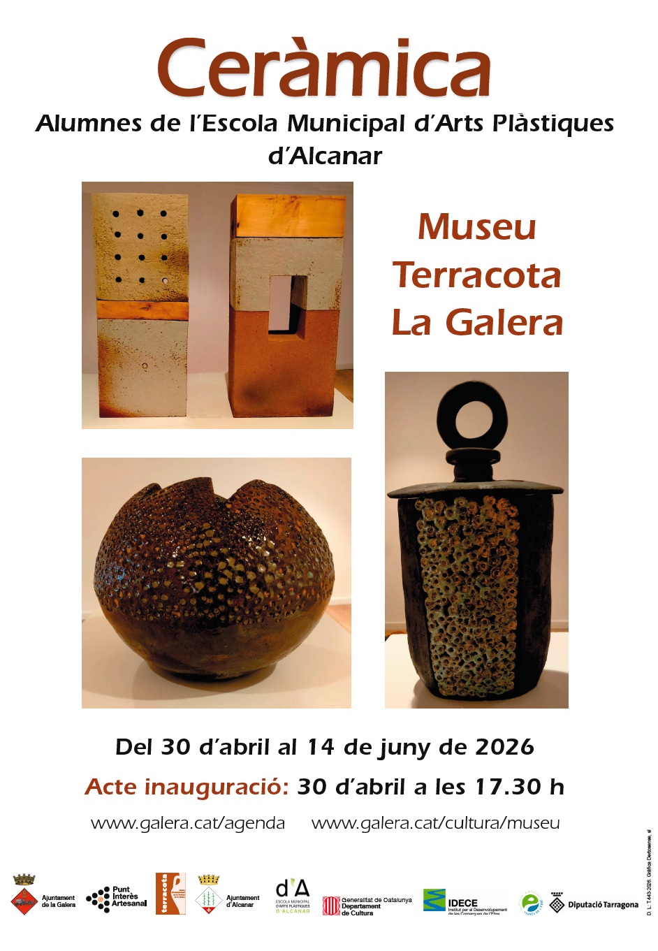Del 30 d’abril al 14 de juny de 2026, la Sala 2, sala d'exposicions temporals de Terracota, Centre d'Interpretació de la Terrissa de la Galera, acollirà una exposició de peces de ceràmica elaborades pels alumnes de l’Escola Municipal d’Arts Plàstiques d’Alcanar.